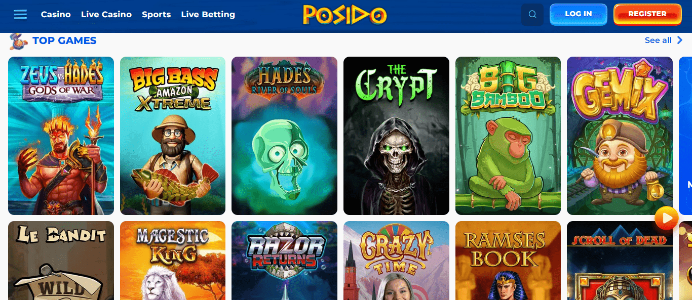 Posidossa voit pelata monia kolikkopelejä ja hyvän valikoiman pöytä- ja korttipelejä. Näitä tuetaan virtuaalisessa ja live-muodossa, ja ne sisältävät erilaisia pokeri-, baccarat-, ruletti-, blackjack-muunnelmia ja muita. Löydät myös suotuisat kertoimet ennen ottelua ja pelin aikana muutamista urheilulajeista, kuten jalkapallosta, tenniksestä, koripallosta, jääkiekkosta ja muista.